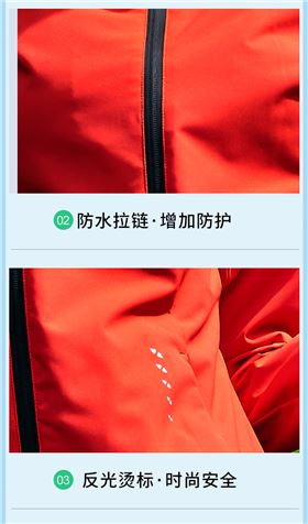 此款梭织风衣26647/26648采用消光桃皮平纹面料,立体幻彩标,彰显品质;防水拉链,增加防护;反光烫标,时尚安全;高密防风面料,防风透气;后背风琴反光,伸展自如并安全时尚。
